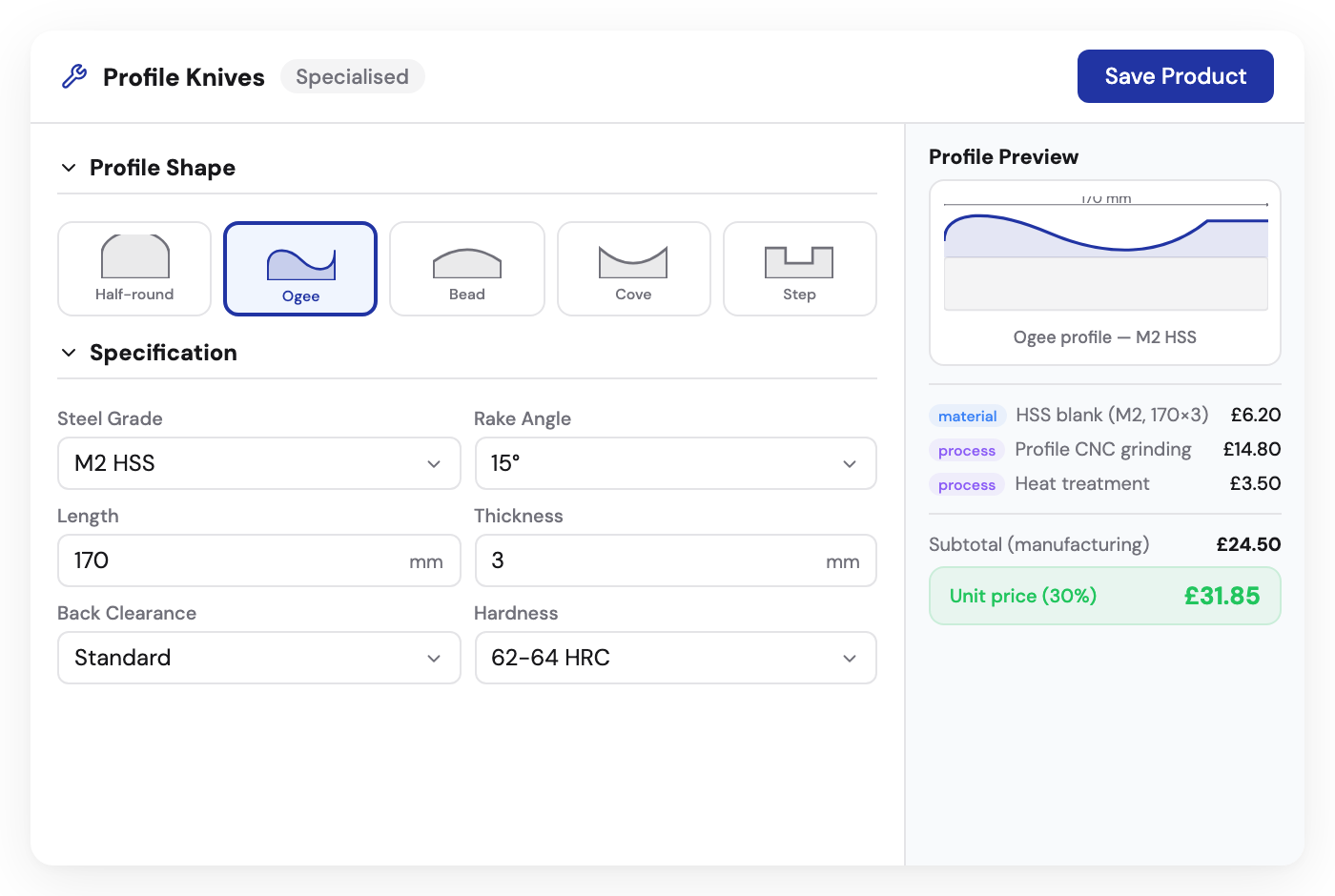 Woodworking and metalworking profile knives with custom geometries. Upload or select profiles, define steel grade, coating, and bore - then generate accurate quotes that factor in grinding time and tooling setup.